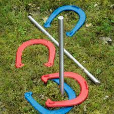 Horseshoes is a traditional outdoor game that involves throwing metal horseshoes at a set of stakes in the ground. The game is typically played with 2 players or teams and can be enjoyed by people of all ages. The objective of the game is to score points by getting the horseshoes to land as close as possible to the stakes, with different areas of the stakes earning different point values.